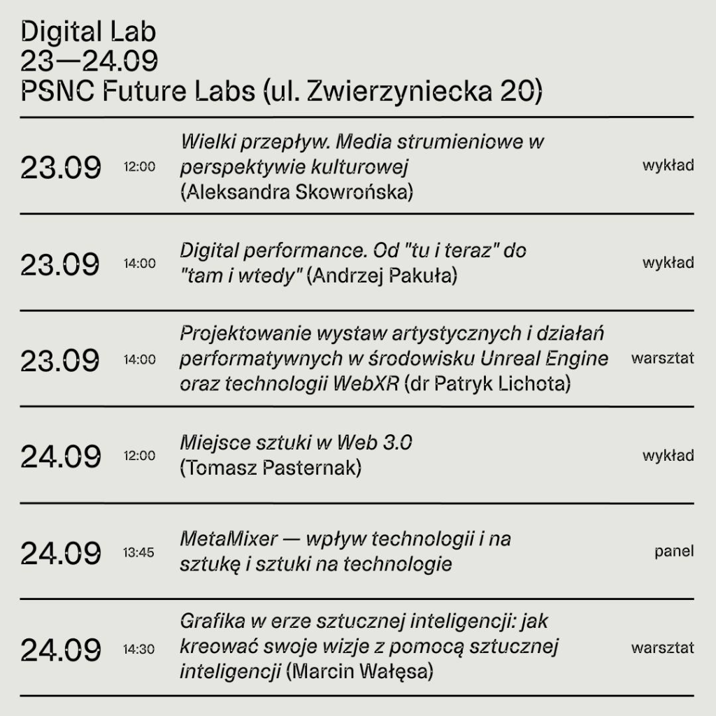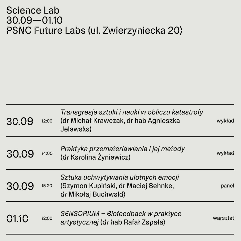 Art&Science Lab to cykl workshopów oraz wykładów dotyczących łączenia praktyk artystycznych technologicznych i naukowych. Tematyka realizowana w ramach trzech weekendowych spotkań to stosowanie immersyjnych technologii multimedialnych, Ai, interaktywność czy realizacja praktyk badawczo artystycznych i ich adaptacji w procesie twórczym i artystycznym.
